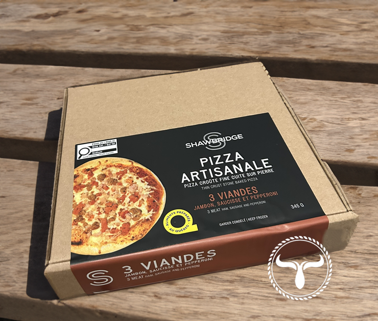 Pizza artisanale 3 viandes faite à la main, cuite au feu de bois de la MicroBrasserie Shawbridge, emballée sous vide