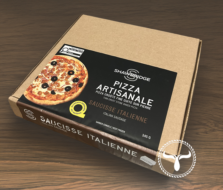 Pizza artisanale Saucisses faite à la main, cuite au feu de bois de la MicroBrasserie Shawbridge, emballée sous vide