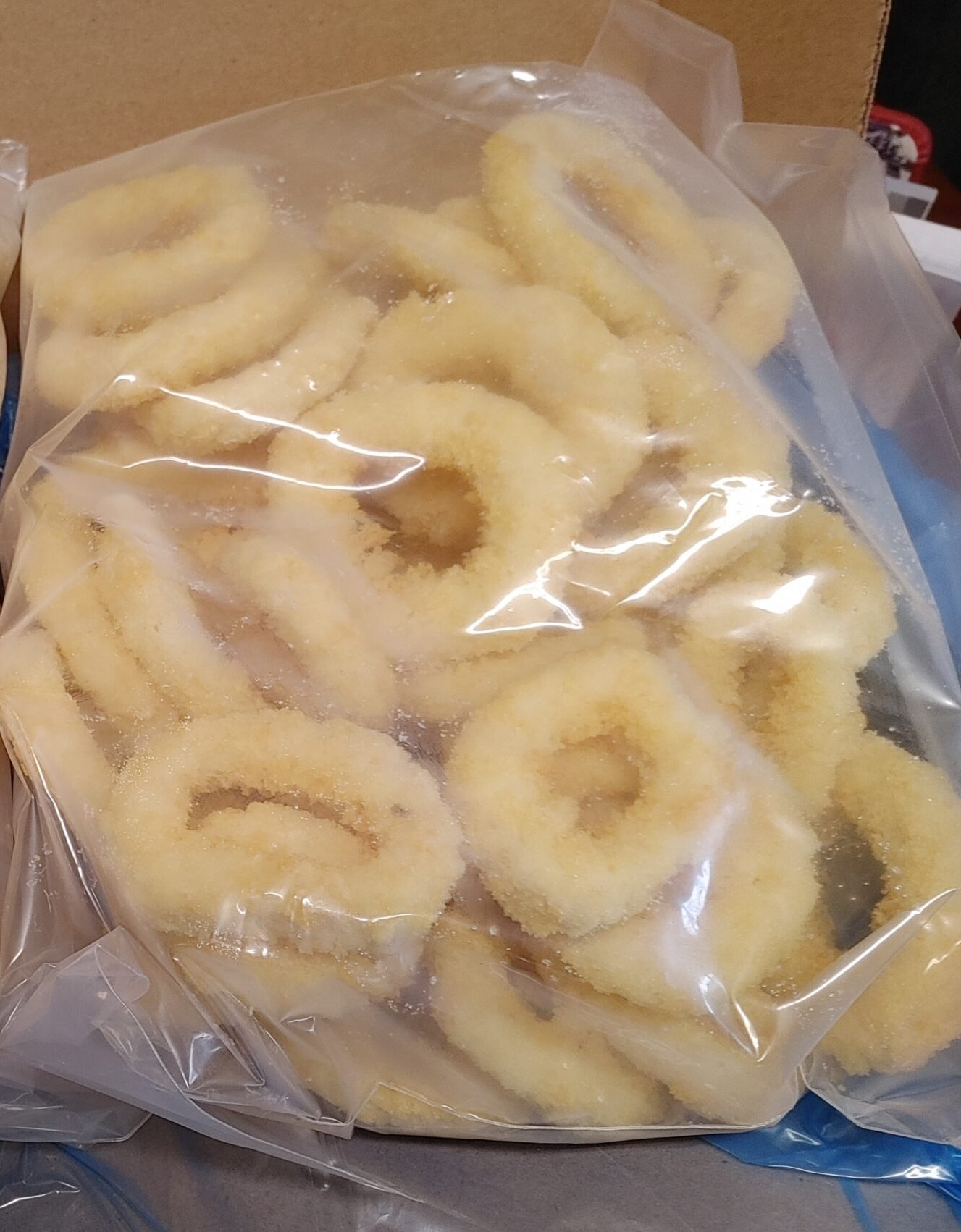 Ingrédients: Calmar, farine de blé, huile de soya, amidon de tapioca modifié, eau, gluten de blé, amidon de maïs modifié, farine de maïs modifié, sel, dextrose, épices, poudre à lever (disodium d’hydrogène, pyrophosphate, bicarbonate de sodium) Phosphate de xanthane, disodines, ribonucléotine, s’améliorant de farine (acide ascorbic, sulfate de calcium, fécule de maïs) Contient: calmar, gluten et soya