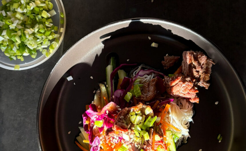 - 900 g bavette de bœuf, cuite et tranchée mince